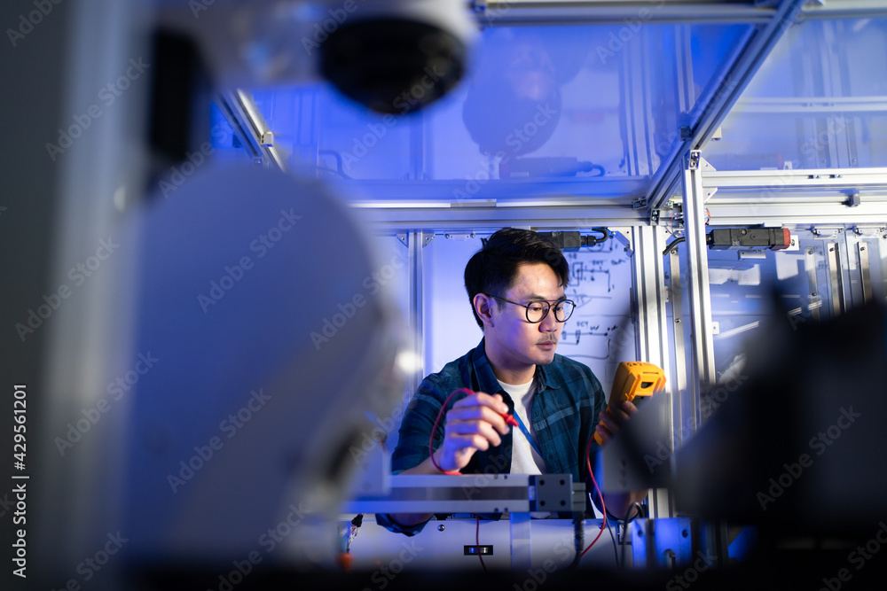 Young Asian male electrical engineer looking at a digital multimeter's screen in hand while using it checking voltage to fix an industrial machine with a blurred of robotic machine in the foreground.