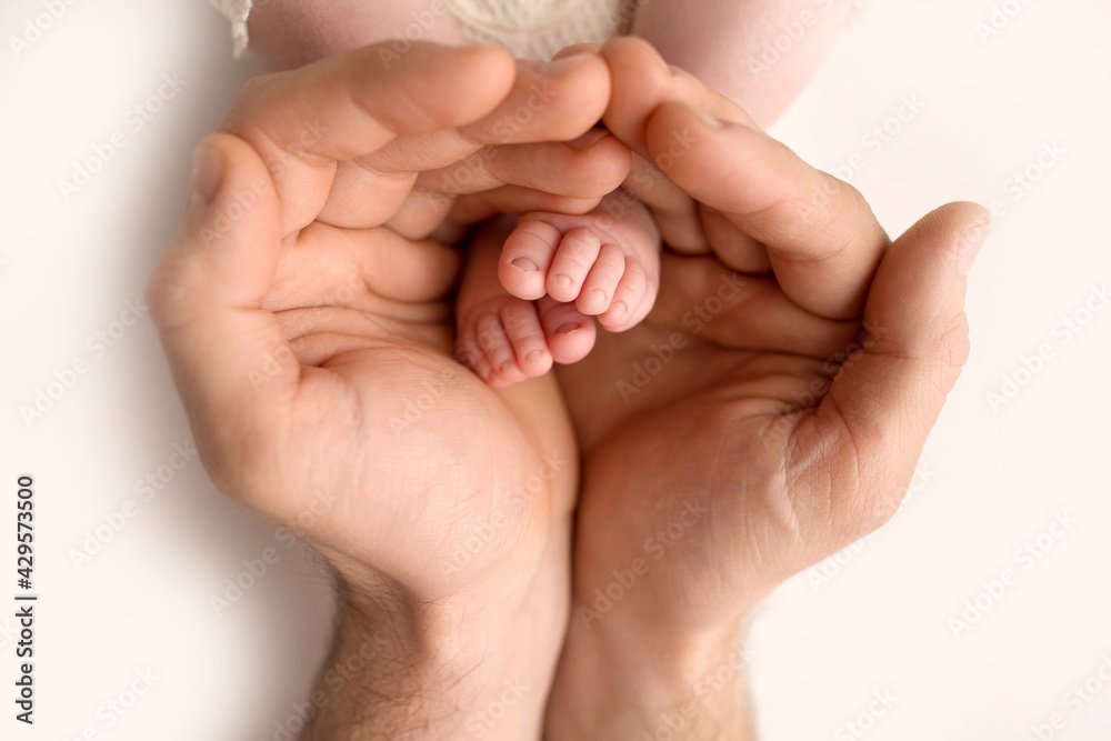 Children's feet in hold hands of father on white. Father and newborn Child. Happy Family people concept.