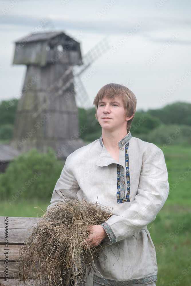 Downshifting concept. A young guy in national clothes lives in an eco-village and earns money from it