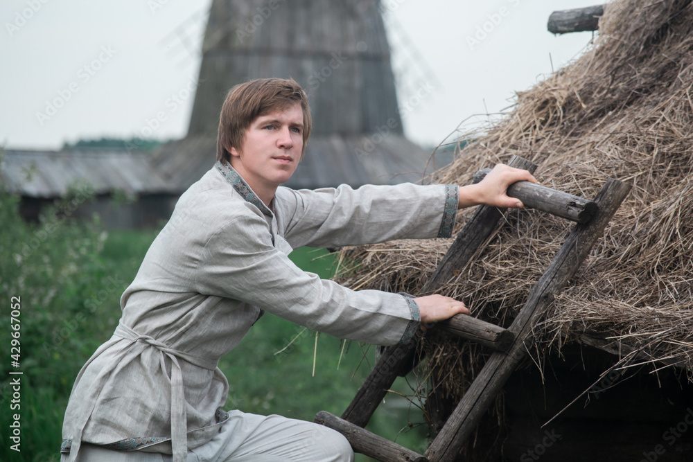 Downshifting concept. A young guy in national clothes lives in an eco-village and earns money from it