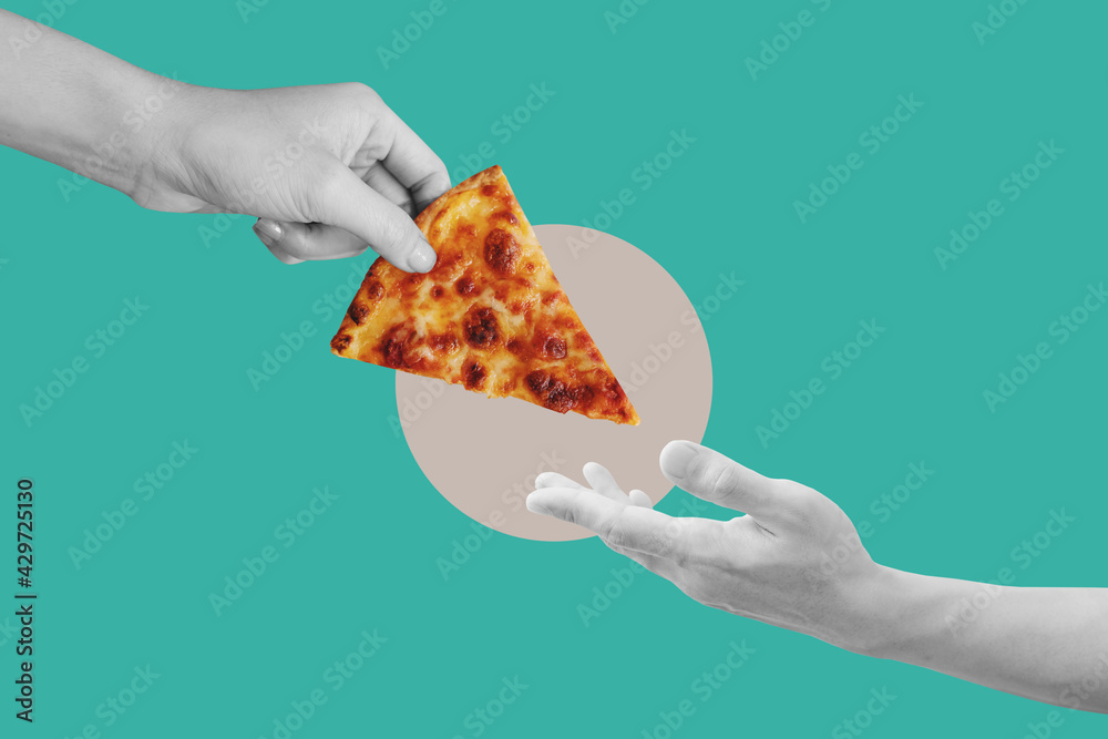 Digital collage modern art. Hand giving and receiving slice of cheese pizza