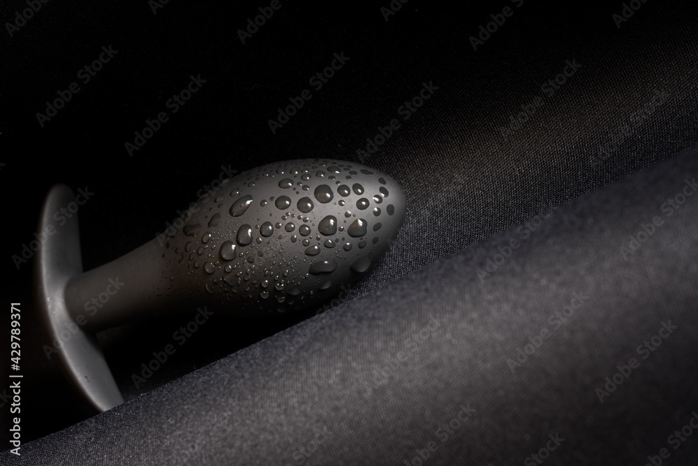 A wet black butt plug lies on a dark surface. Moisture or lubricant drops. Sex toy and pleasure. Diagonal. Close-up.