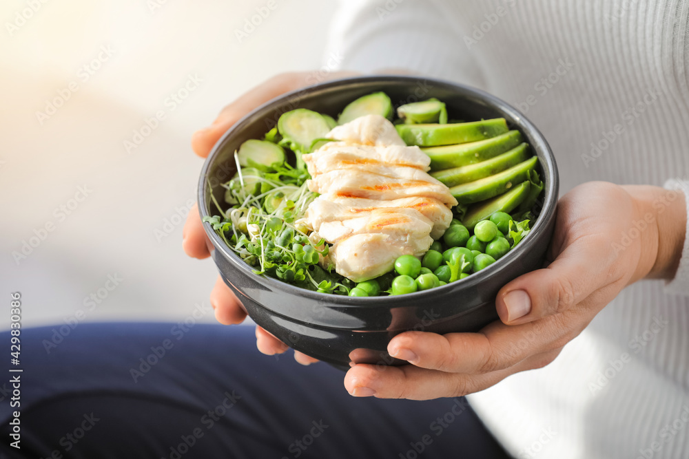Woman holding bowl of tasty salad with fresh vegetables and chicken, closeup