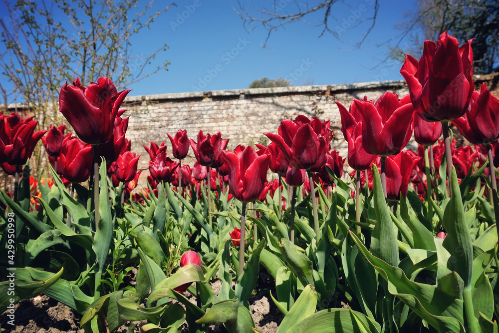 Red single lily flowered tulip 'Pretty Woman' in flower