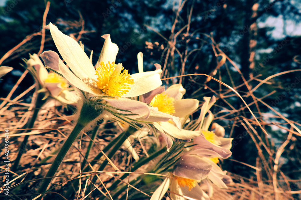 Pasqueflower or Sleep-grass, Pulsatilla patens, one of the spring primrose. Retro toned