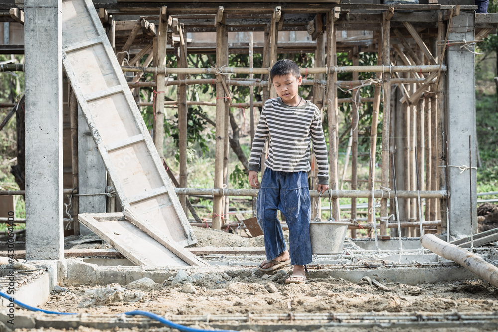 Children working at construction site for world day against child labor concept, Poverty, Human trafficking.