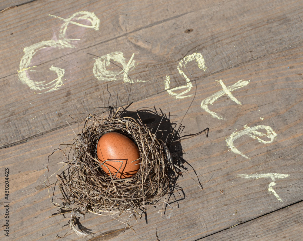 Easter egg in a coiled nest on a wooden background and the inscription "Easter" with colored crayons.