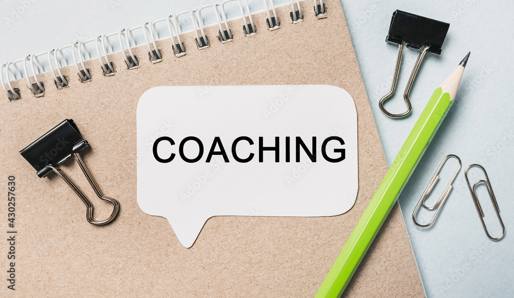 Text COACHING on a white sticker with office stationery background. Flat lay on business, finance and development concept