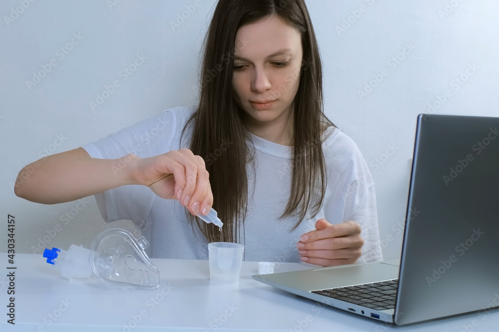 Woman is doing medicine saline with medicaments for inhalation at home. She looking the instructions on the Internet on laptop. Adding drops of medicine in nebulizer. Fibrosis, covid-19, asthma, copd.