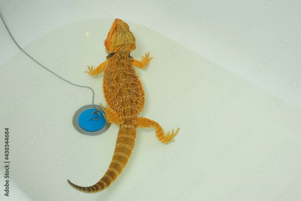 Baby bearded agama bathing in the bathroom in clear warm water near drain stopper, closeup view. Exotic domestic animal, pet. The content of the lizard at home. Cute amazing animal from Australia.