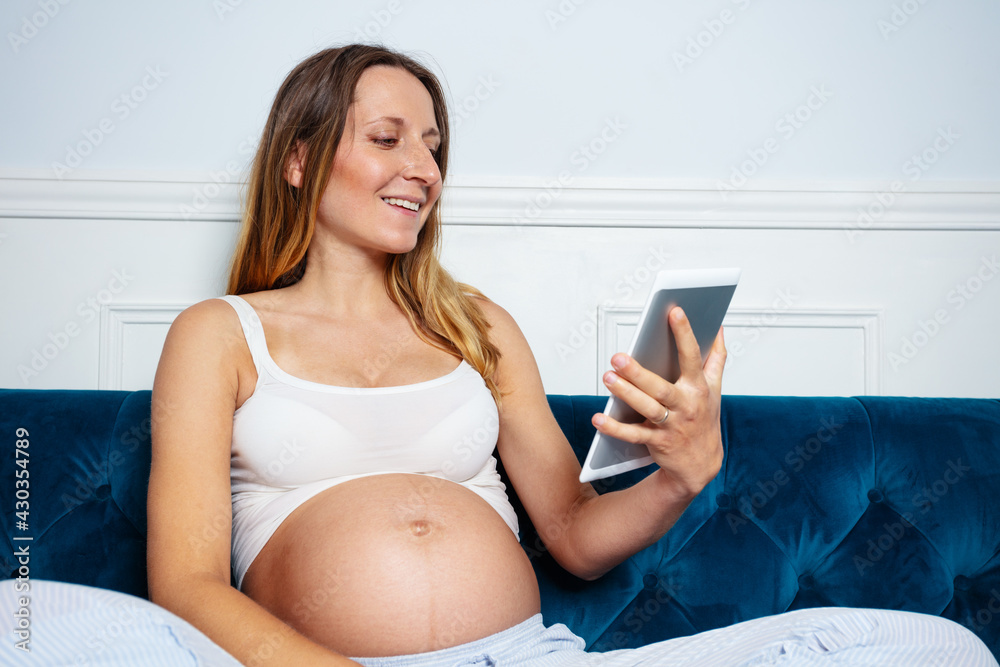 Happy smiling pregnant woman sit on the sofa