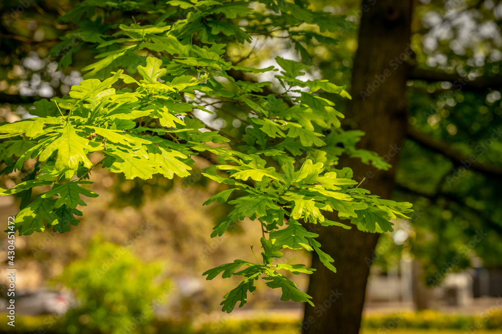 detail of common oak (Quercus robur) leafs with blurred background in springtime
