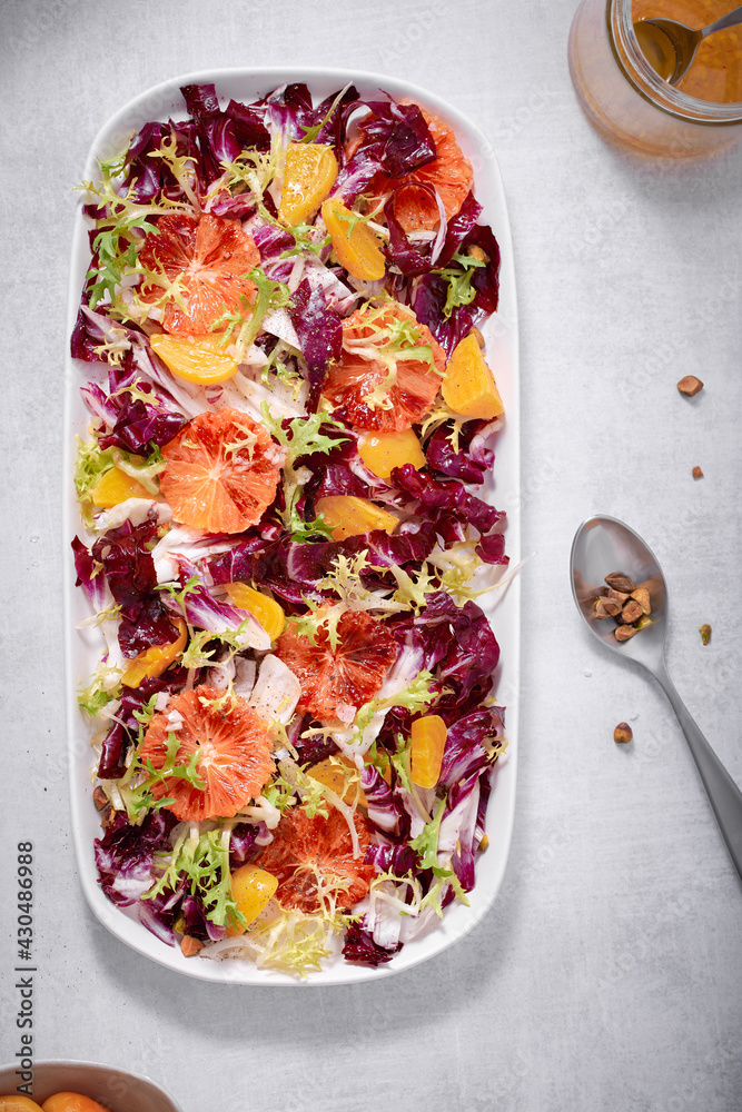 Blood orange, golden beet, radicchio, and frisee (endive) salad with pistachios.