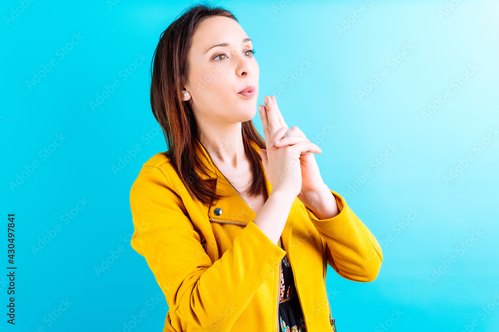 Beautiful young adult woman in yellow jacket blowing her fingers like a gun. weapons concept. achieve goal