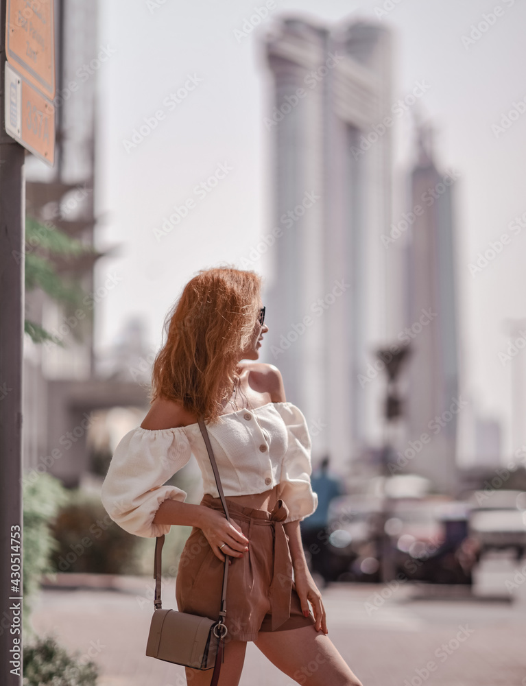 Stylish tourist woman in shorts and off-shoulder blouse top is enjoying sightseeing tour during vacation in Dubai in United Arab Emirates. Luxury and comfortable tourism season in UAE cityscapes