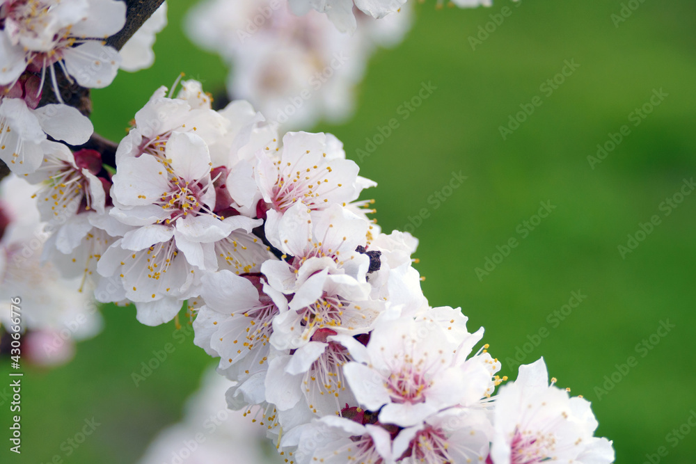 Large white flowers of common apricot in early spring. Fruit tree Prunus during flowering. Gardening. Spring time