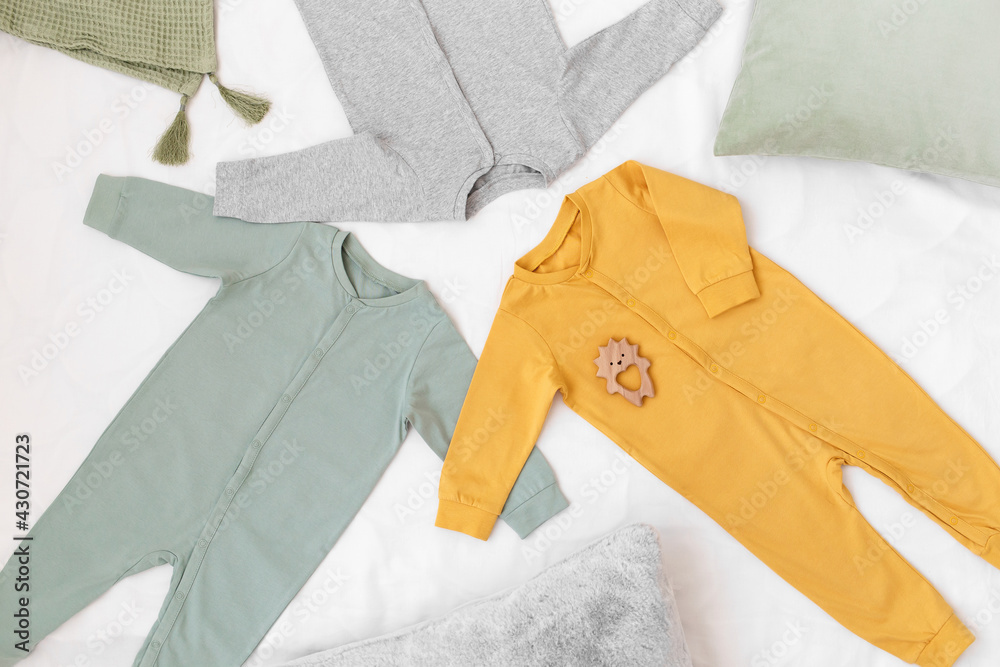 Three children's jumpsuit in green yellow and grey color, pillows and blanket lying on a white background. Baby clothes, flat lay.