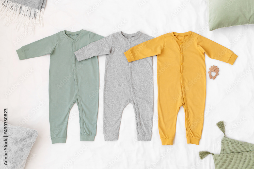 Three children's jumpsuit in green yellow and grey color, pillows and blanket lying on a white background. Baby clothes, flat lay.