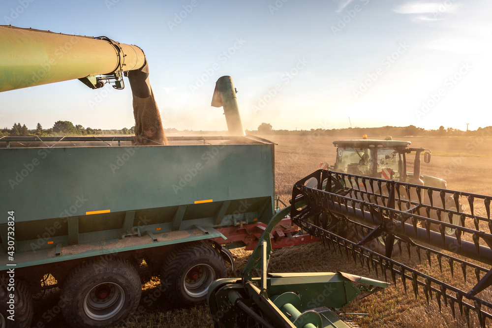 Combine harvester unloading wheat into a grain cart