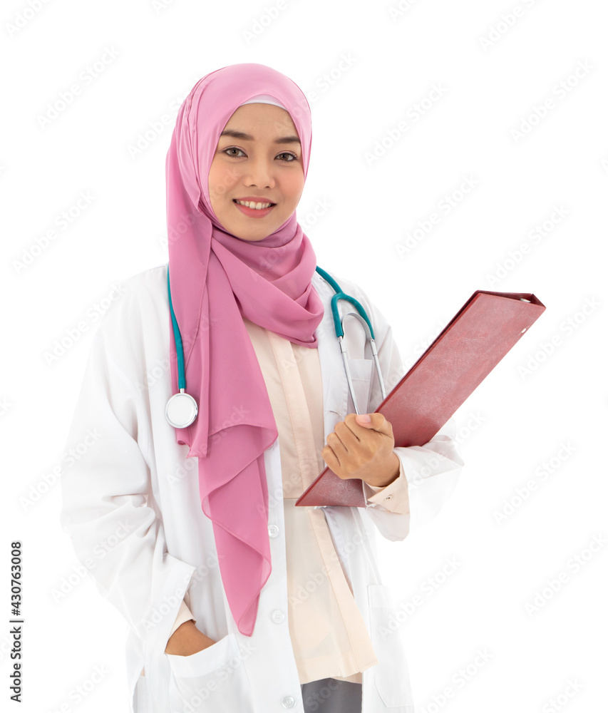 Muslim asian female doctor smiling and holding a red folder isolated on white background with clipping path. Concept of health care, professional.