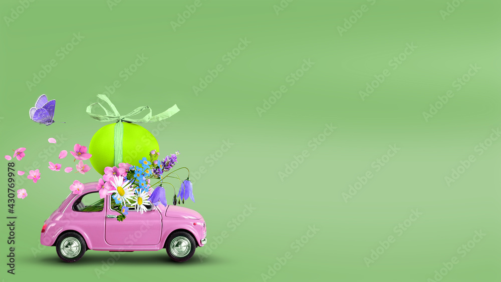 Pink toy car carrying an easter egg and wild flowers on the roof on a green background.