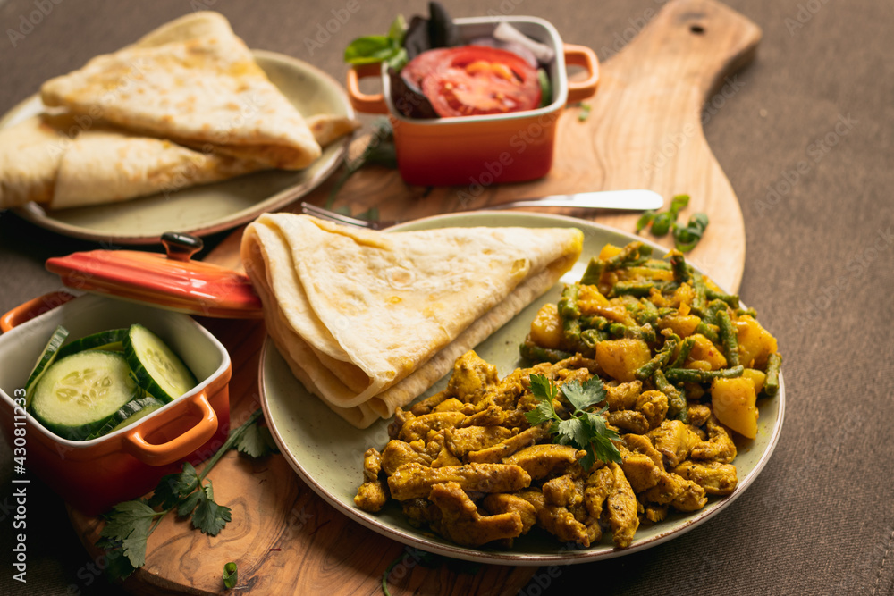 Indian-surinamese spicy food lunch and dinner, roti chicken curry