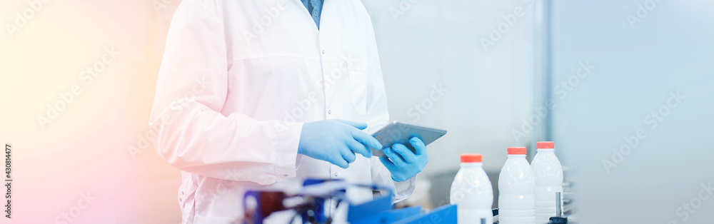 Concept food industry banner. Worker inspecting production line bottle milk dairy factory with computer tablet