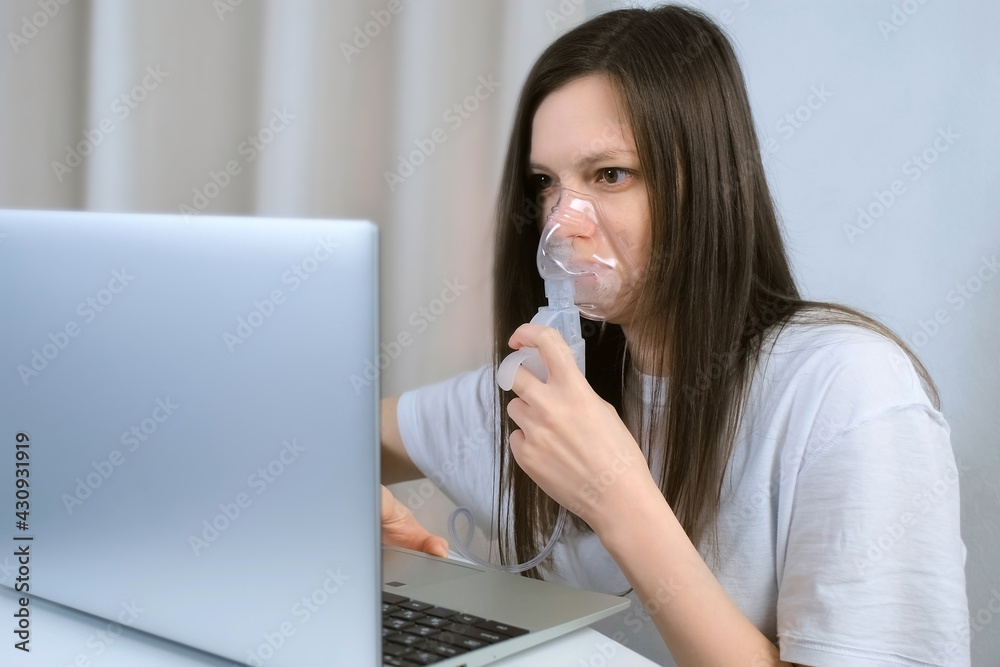 Sick young woman is using nebulizer and inhaler for treatment at home and working on laptop. She is breathing in mask. Fibrosis, covid-19, asthma, copd. Treatment, cure and procedure, therapy.