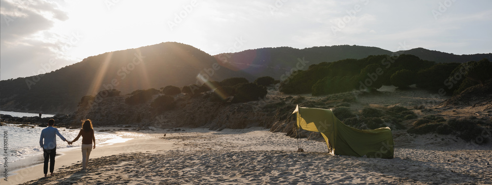 Horizontal banner or header Back view couple walking on the sea shore holding hands during sunset. Camping tent on background.