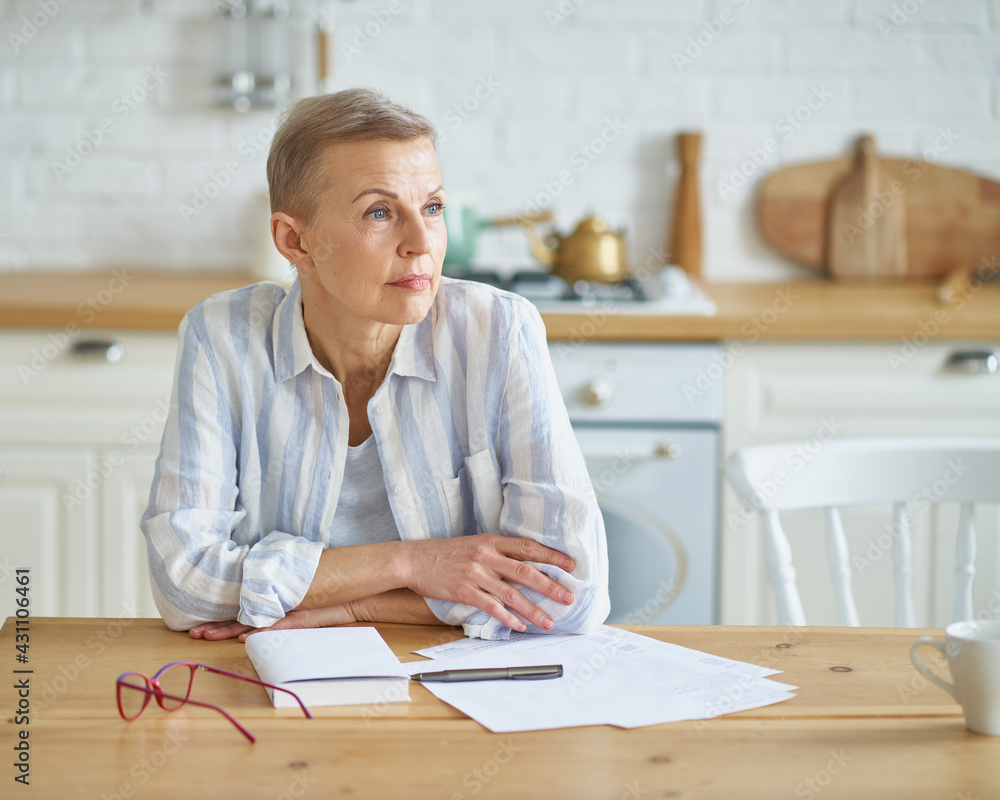 Beautiful mature woman looking aside and thinking about something while sitting at wooden table in kitchen and working with documents. Senior people and distance work concept