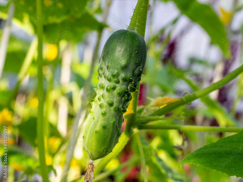 Young juicy fresh cucumber growing in the vegetable garden. Healthy food concept. Fresh Organic vegetables for diet. Harvesting a new crop