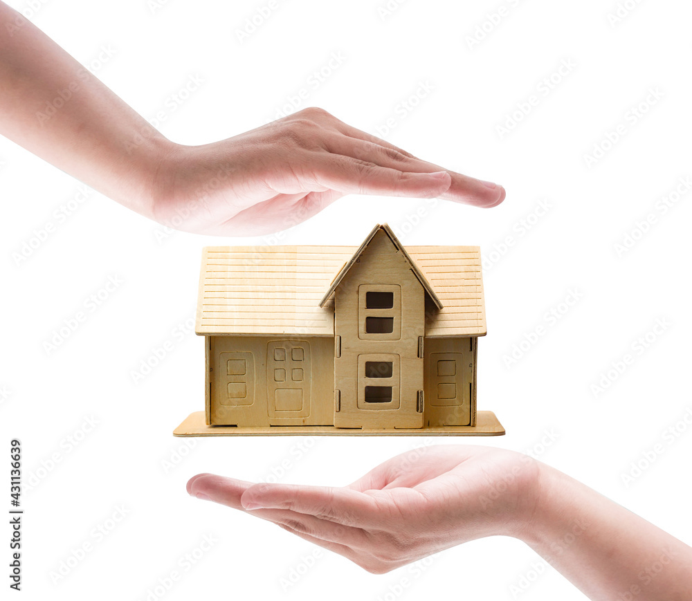 Close up of female hands sheltering modern house,Small wooden house covered by hands,Home protection and insurance concept,