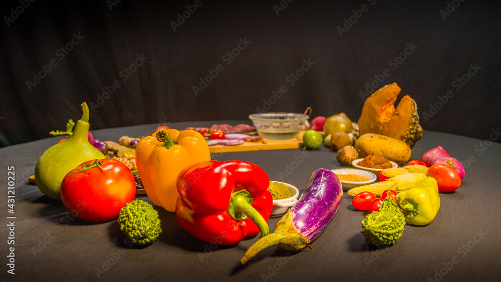 .Preparing cooking materials. Fresh vegetables,Fresh fish fillets and spices are placed on a dark table. .