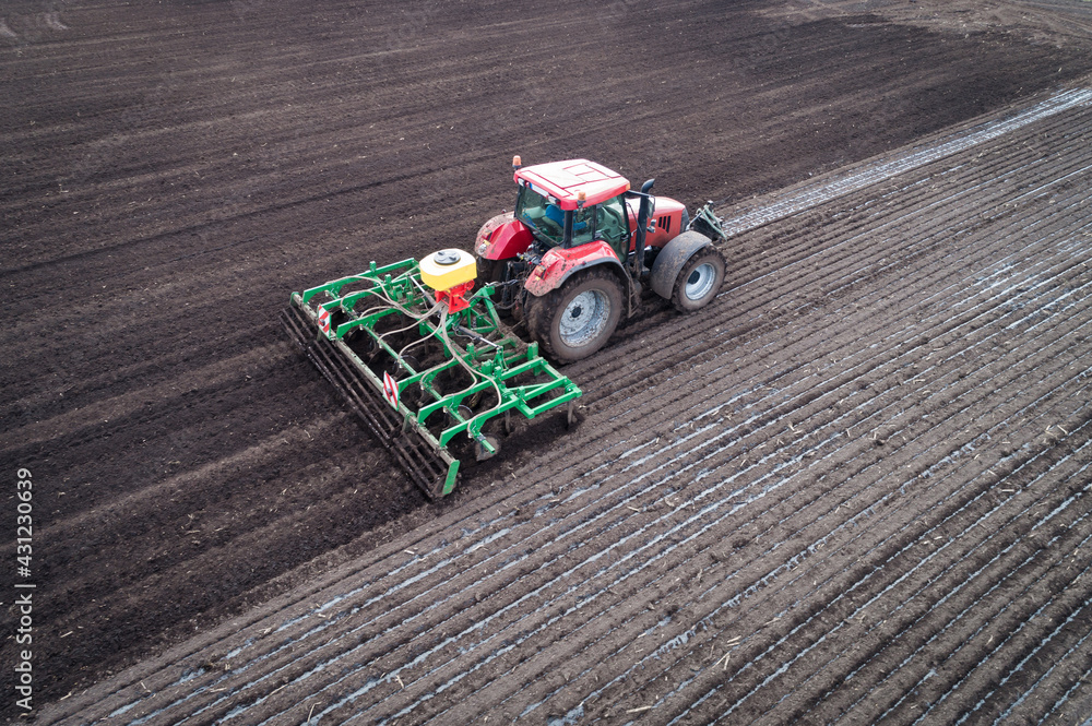 Ackerbau - Traktor bei der Bodenbearbeitung, Luftbild
