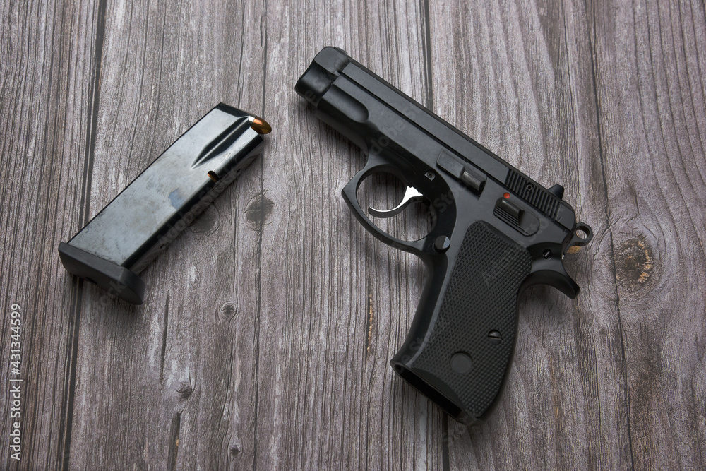 Still life with black handgun with cartridge magazine on old grungy brown wooden background, Black semi-automatic pistol on wood table