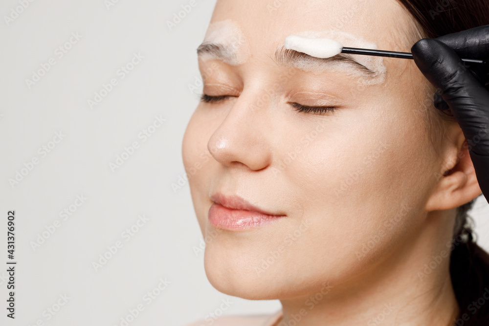 Master applies brow paste with a brush to eyebrows. Styling and lamination of eyebrows. Woman doing eyebrow permanent makeup correction. Gloved master combing patient’s eyebrows with a special brush.