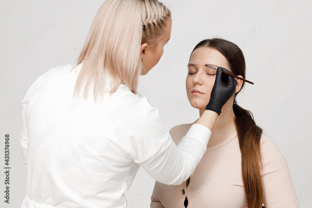 Master applies brow paste with a brush to eyebrows. Styling and lamination of eyebrows. Woman doing eyebrow permanent makeup correction. Gloved master combing patient’s eyebrows with a special brush.