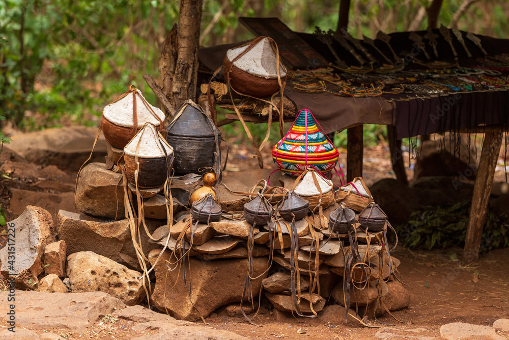 Souvenir shop next to the entrance to the ancient church Unesco Monastery Ura Kidane Mehret in Bahir Dar, Ethiopia. Traditional vintage leather handmade basket for food