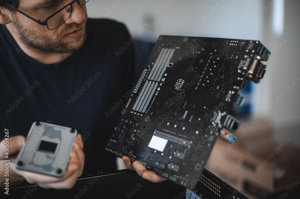 portrait of a handsome nerd man is servicing Computer motherboard and cooler.