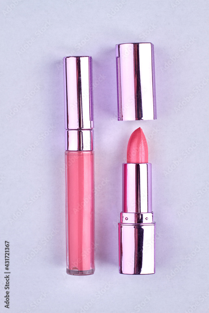 Makeup products isolated on white background. Pink lipstick and lip gloss.