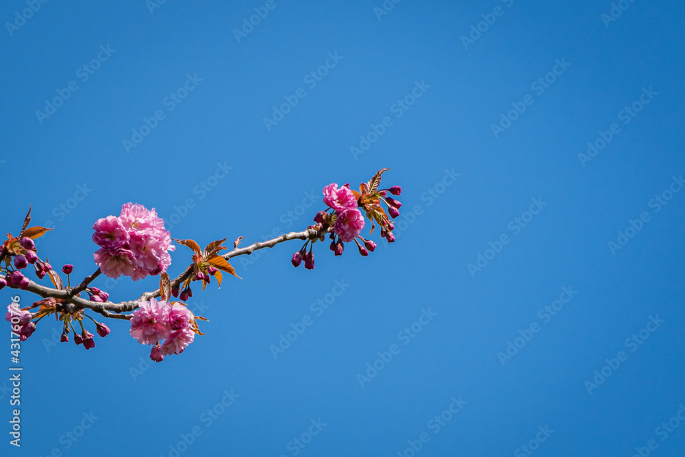 Blooming Tree Prunus 'Kanzan' (Prunus serrulata) with pink flowers. Twig of Prunus 'Kanzan' (Prunus serrulata) against blue sky. City Park "Krasnodar". Spring of 2021. Japanese cherry flowers.