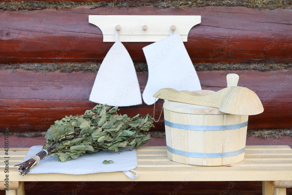 A different accessories for sauna and bath treatments are on the wooden bench and log dark red wall.