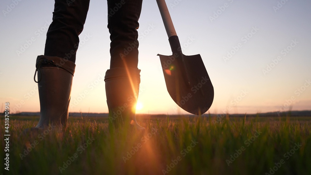 agriculture. farmer with a shovel walk in the field. agriculture business harvesting of a farmer man with shovel a walk to work in the field. business soil sun natural roducts harvest