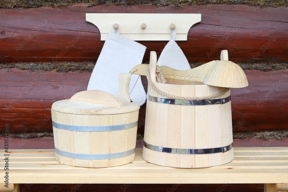 A different accessories for sauna and bath treatments are on the wooden bench and log dark red wall.