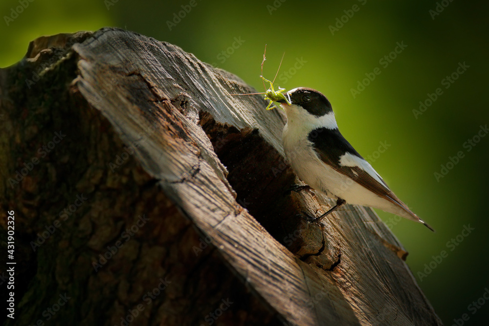 Collared flycatcher, Ficedula albicollis, black and white small passerine bird near the tree trunk nest hole. Flycatcher with catch in bill, green insect grasshopper. Spring time, feeding behaviour