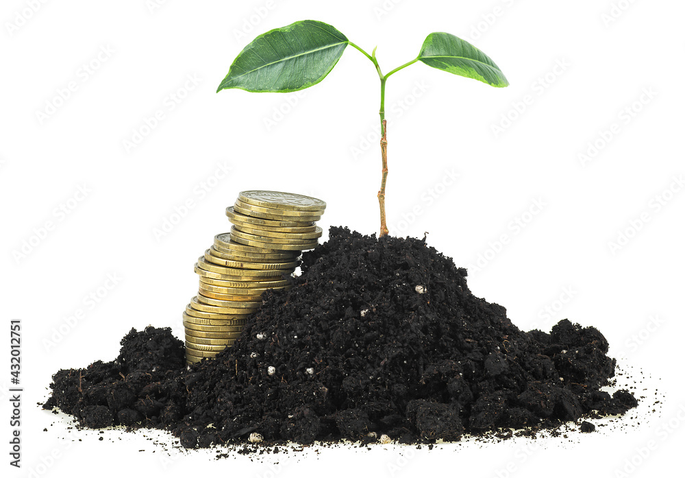 Gold coins in soil with young plant isolated on a white background. Money grows in the soil.