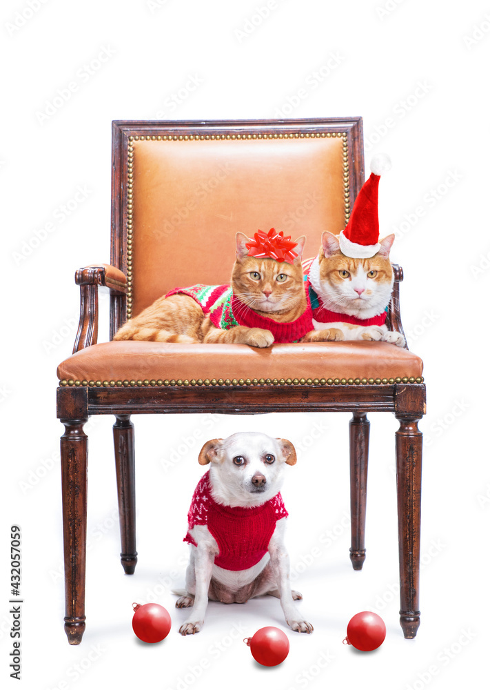 outdoor shot of a cute dog and cats on an isolated blue sky background
