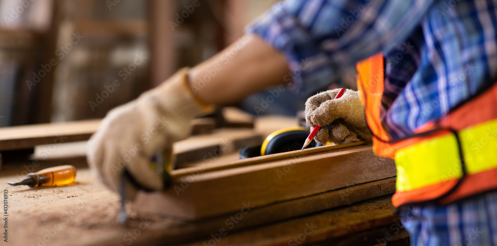 Close up hand of Asian elderly carpenter man working woodwork for home use. Construction industry concept. Tools for woodwrok pencil hammer meter and screw-driver.