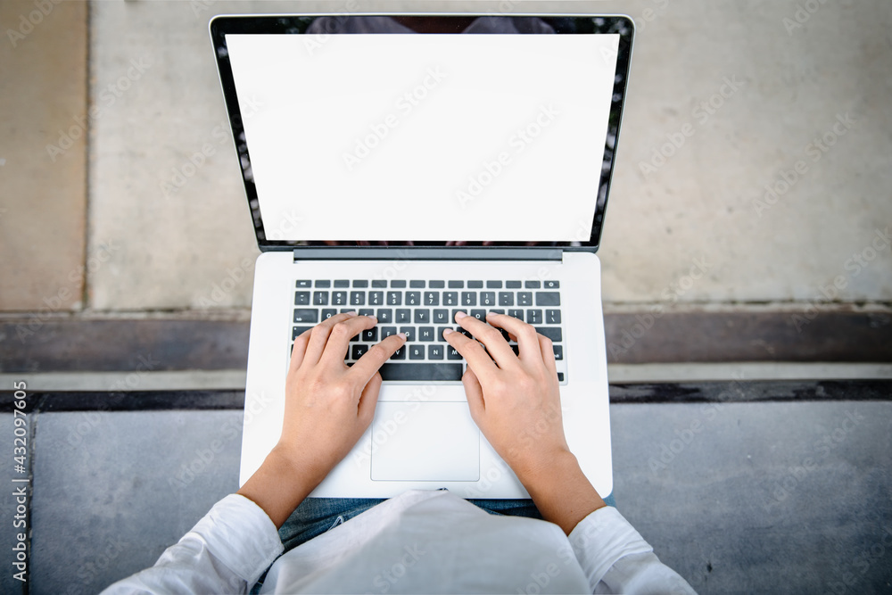 Close-Up of Woman Using Laptop for Business Communication While Sitting on Garden Bench. Businesswoman Use Computer Laptop for Remote Owner Business at The Backyard. Technology Communications Online