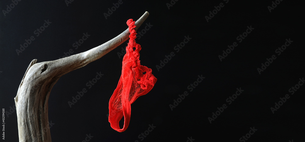 tanga rojo colgado de una rama seca lencería de mujer sobre fondo negro 4M0A0615-as21